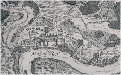 Die älteste von Steinheim (damals (Ober)Steinheim mit Schloss und Niedersteinheim, später auch Groß- und Klein-Steinheim) bekannte Karte aus dem Jahre 1597. Rechts oben vor dem Waldrand ist der zweischläfrige Galgen mit Spitzen und Kugel und Querbalken zu sehen5.